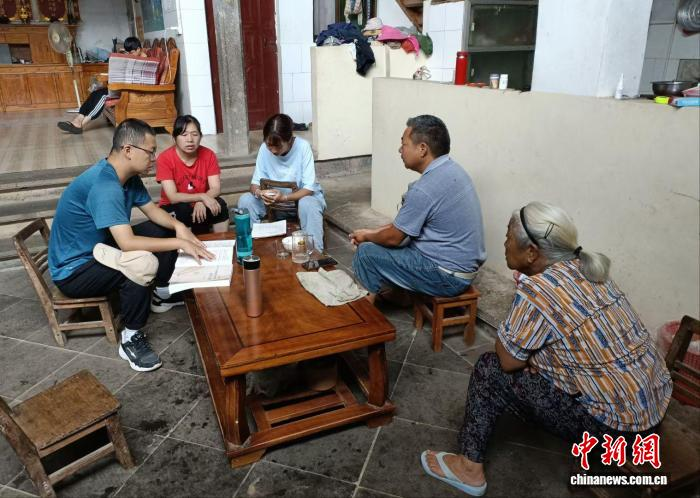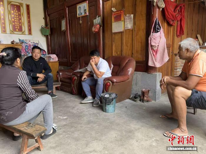 2021年6月,谢飞(左一)到村民家中走访。受访者 供图