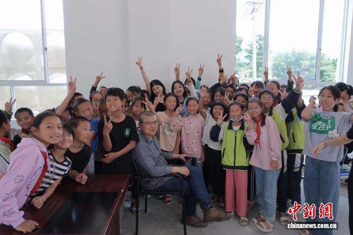 2023年7月,杨江波在上河东村界端小学与学生们合影。受访者 供图