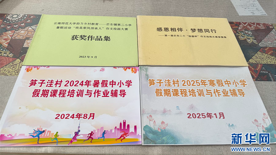 走进梁河县芒东镇笋子洼村委会“明德农村教育发展教研室”,一摞打印成册的资料引人注意,里面展示着笋子洼村及周边村寨部分中小学生的作文绘画作品等内容。