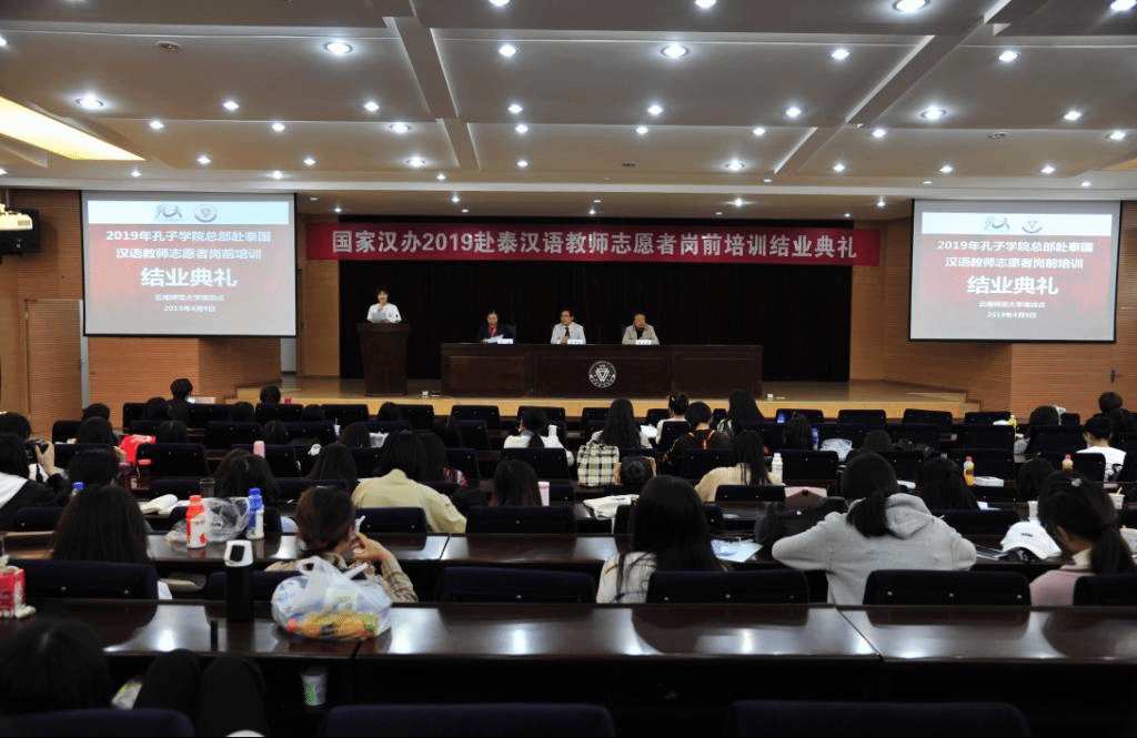 2019年4月9日上午,由孔子学院总部主办、德赢官网Vwin汉语国际推广师资培训基地(昆明)承办的2019年赴泰国汉语教师志愿者培训结业典礼在德赢官网一二一西南联大校区田家炳书院二楼报告厅举行。德赢官网Vwin国际汉语教育学院院长、汉语国际推广师资培训基地(昆明)执行主任王秀成教授,国际汉语教育学院副院长李天明,汉推基地办公室负责人严钰,以及汉推基地全体工作人员,教师代表、班主任,来自云南、湖南的131名培训学员共同出席了结业典礼。