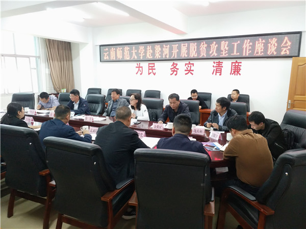 饶卫书记一行与梁河县县长龚翠莲、县委副书记孟诚琨、县政协副主席寸尊代以及县各职能部门负责人召开了座谈会,共商梁河县脱贫攻坚事宜。饶卫书记强调,2019年梁河县要实现脱贫摘帽,是我们向党交出答卷的时候,要按照中央、省、市制定的目标,按梁河县制定的十个措施,落实责任,精准扶贫,确保按时完成脱贫攻坚任务。