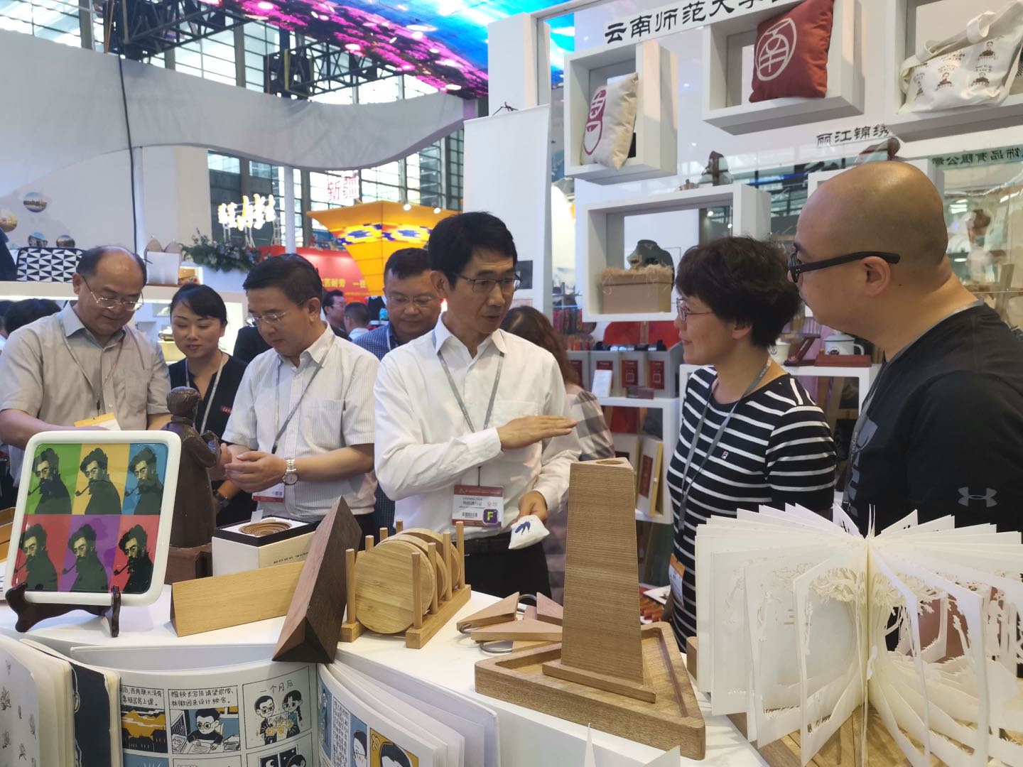 集中展示西南联大精神的深刻内涵和文化的深厚底蕴,成为此次文博会云南馆的关注焦点。5月18日上午,云南省委常委、云南省委宣传部部长赵金,云南省委宣传部常务副部长罗杰,省文化和旅游厅党组成员、副厅长孙炯等领导一行来到西南联大文创展区。赵金部长对德赢官网Vwin美术学院充分发挥专业特点、多层次多视角深入挖掘西南联大的文化品格,创意设计具有西南联大精神的文创产品,积极传承西南联大精神,给予了充分肯定。赵金部长指出,要把西南联大文化和精神通过文创设计作品创作的形式宣传推广到全省、全国的大学生中,让收藏在展柜里的文物,书写在古籍里的文字都活起来,向世界传播西南联大文化,讲述西南联大历史和故事,提升中国文化的对外吸引力和影响力。德赢官网Vwin要更深入地挖掘和解读“刚毅坚卓”的校训,用更具时代特色的方式予以呈现和弘扬。
