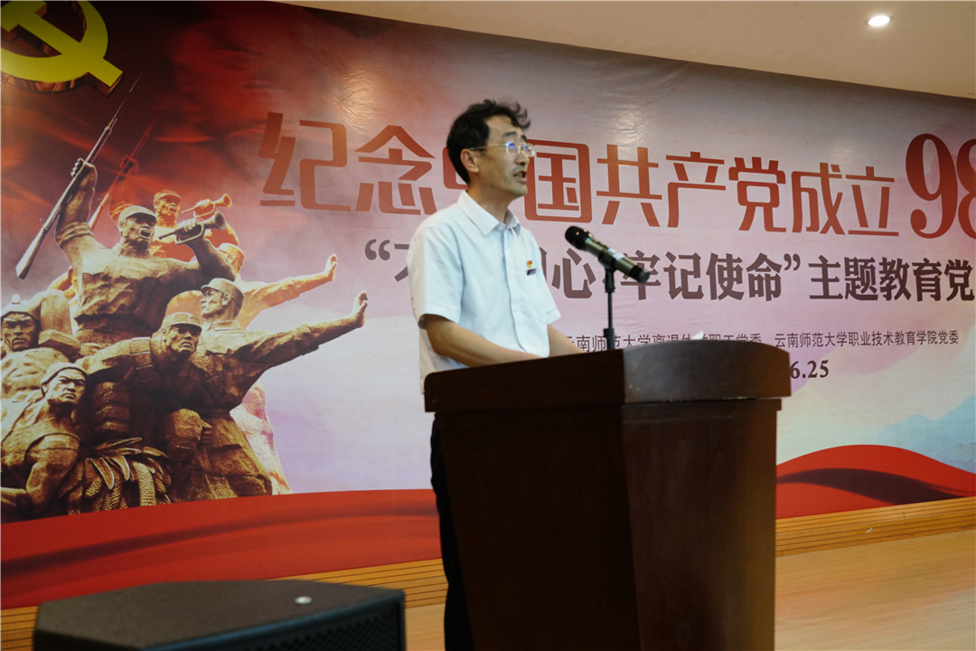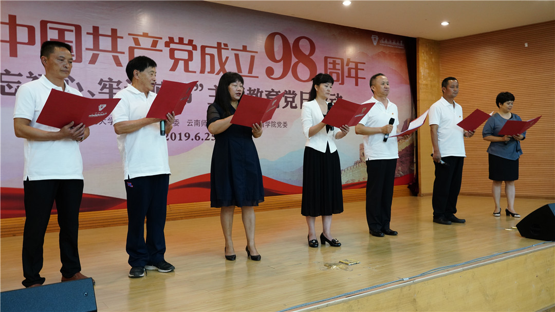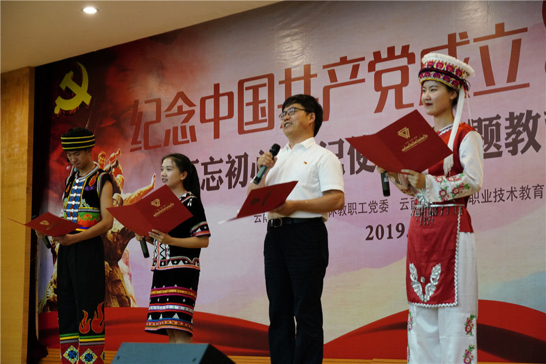 为庆祝中国共产党成立九十八周年,离退休教职工党委与职业技术教育学院党委于2019年6月25日下午,在一二一联大校区田家炳教育书院二楼报告厅联合举办“不忘初心、牢记使命”主题教育党日活动。德赢官网Vwin党委副书记张玮同志,云南省委老干部局政治待遇处魏晓东同志,学校老领导,组织部、宣传部、学生处、一二一联大校区管委会、保卫处、职业技术教育学院等单位负责人,老党员、青年学生党员共250人参加了此次活动。活动由“表彰先进”和“颂歌献给党”两个部分组成,分别由离退休教职工党委书记王琼玲同志、周林老师和职业技术教育学院学生王梦雅主持。