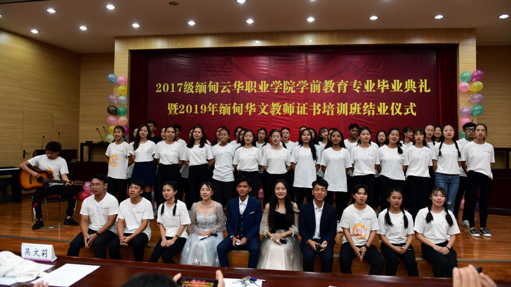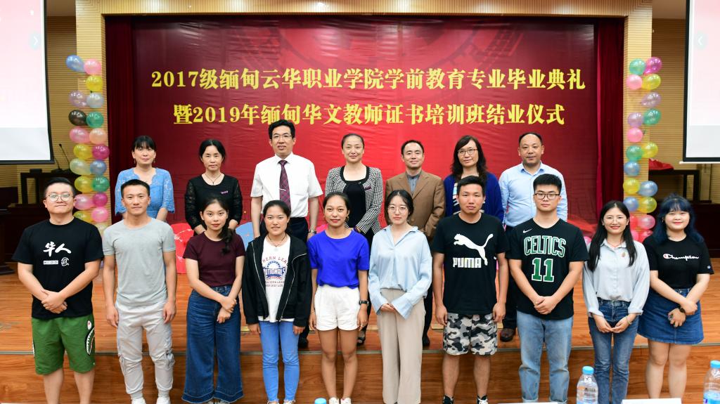 7月25日晚,德赢官网云南华文学院举办了2017级缅甸云华职业学院学前教育专业毕业典礼暨2019年缅甸华文教师证书培训班结业仪式。云南省委统战部国外侨务处副处长甘露云、云南海外文化教育中心缅甸分中心主任唐建军,云南华文学院相关领导、教师以及2019年缅甸华文教师证书培训班、2019年缅甸华文教师教材教法培训班的89名缅甸学员参加了活动。仪式由云南华文学院常务副院长段洁云主持。