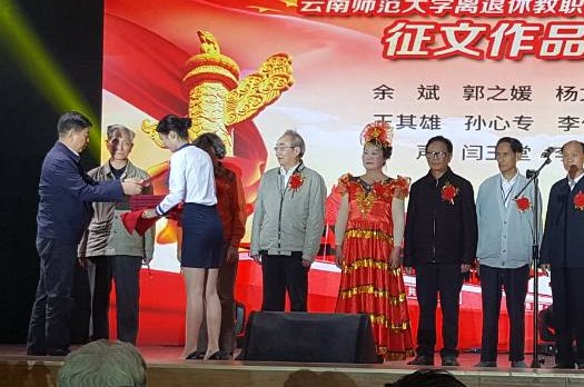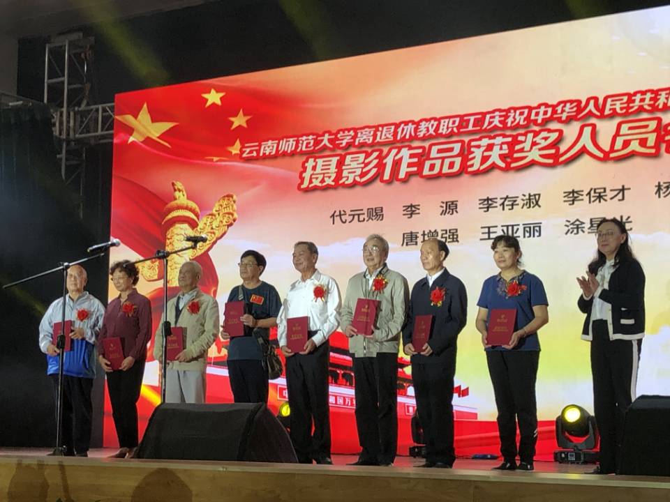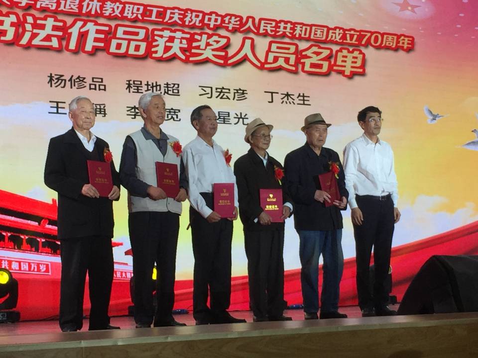 随后,学校对离退休教职工庆祝中华人民共和国成立70周年“祖国颂”主题征文及“祖国美”书画摄影作品征集获奖作品创作者进行了表彰。离退休工作处处长李进宣读表彰决定,校党委书记饶卫、副书记张玮、副校长郝淑美、一二一校区管委会副主任吴雁江分别为优秀文章、书法、摄影、绘画作品获奖者进行了颁奖。