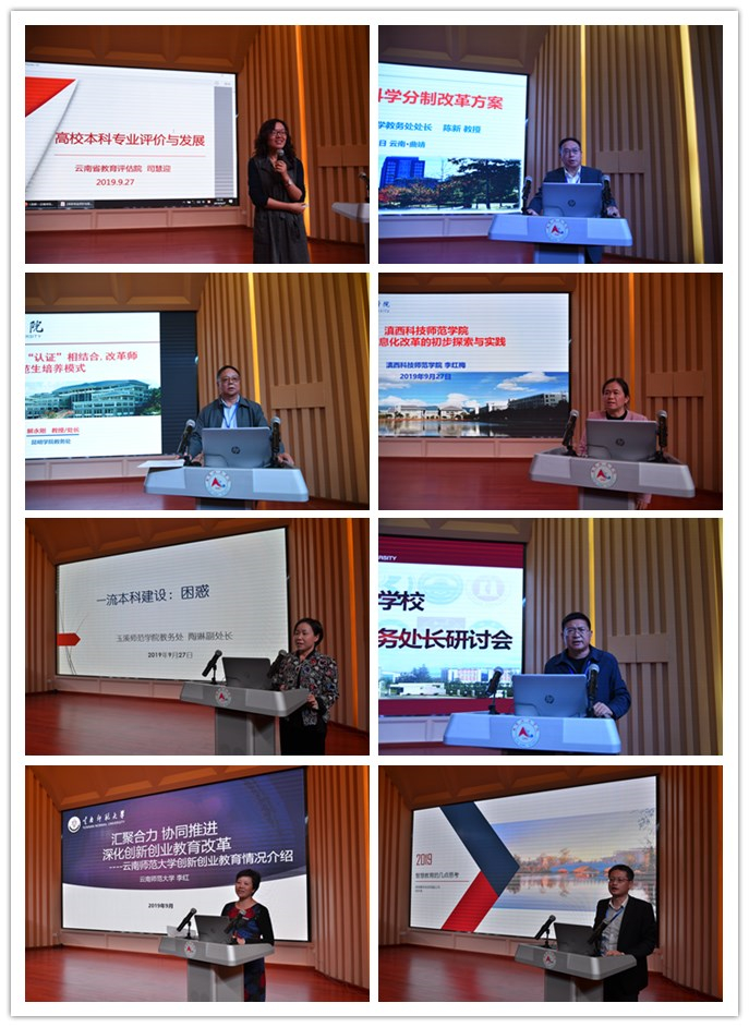 云南省教育科学研究院教育评估院副院长司慧迎、德赢官网Vwin教务处处长陈新、昆明学院教务处处长解永刚、滇西科技师范学院教务处处长李红梅、溪师范学院教务处副处长陶琳、曲靖师范学院教务处处长张廷宪、德赢官网Vwin就业处处长李红、隆本科技公司副总经理刘华美分别以“高校本科专业评价与发展”、“德赢官网Vwin学分制改革”、“‘国考’与‘认证’相结合,改革师范生培养模式”、“滇西科技师范学院教学信息化改革的初步探索与实践”、“一流本科建设:困惑”、“深化创新创业教育改革,全面提升人才培养质量的探索与实践”、“汇聚合力 协同推进 深化创新创业教育改革”、“智慧教育的几点思考”为主题进行了发言和讨论。