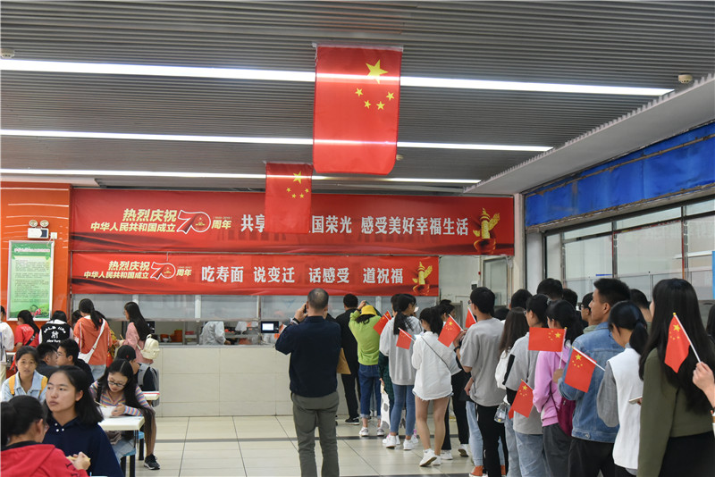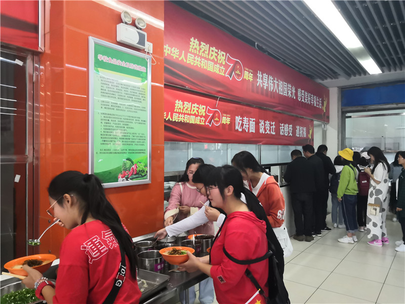 “红妆素裹”的食堂里,国旗飘扬,横幅高挂。食堂的工作人员们从早上7点便开始准备长寿面,静候师生们的到来。中午11点整,活动正式开始,工作人员们手脚麻利,煮面、盛面、加料,一气呵成,将一碗碗长寿面递到师生们手中。据统计,当天共有近万名师生相聚一堂,共享家国情,同吃长寿面,共同庆祝新中国成立70周年。