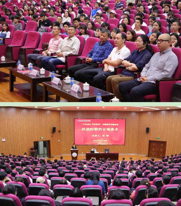 同时,美术学院以“不忘初心、牢记使命”主题教育启动为契机,特邀省文化和旅游厅副厅长孙炯作题为《抗战时期的云南美术》的主题讲座。孙炯副厅长以昆明师范学院艺术系首任系主任,中国著名的油画家、雕塑家廖新学的奋斗历程为主线,与师生分享他们编辑《抗战时期的云南美术》一书的艰难历程,并动情地向师生阐述了抗日战争时期,由北平艺专和杭州艺专南迁至昆明的一批优秀美术家用画笔作“武器”,开展大量创作、教育、研究以及社会活动,为中国抗战美术作出积极贡献。通过一页页精心制作的PPT展示的精美画作,师生们感受到艺术家们的精神风范,感受到新中国的时代变迁,在历史记忆中传承了伟大精神,展现了兴国历程。