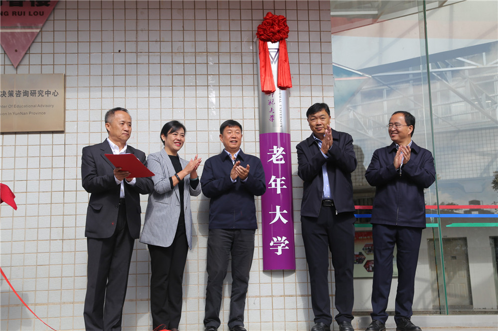云南省委老干部局副局长王从文,德赢官网Vwin党委书记饶卫、校长蒋永文,云南老年大学校长伍敏一同为德赢官网Vwin老年大学揭牌。省委老干部局副局长王从文、我校党委副书记张玮、学校老教授协会会长杨文泽分别致辞和发言。王副局长说,正当全党深入学习贯彻习近平新时代中国特色社会主义思想,第二批“不忘初心、牢记使命”主题教育开展之际,德赢官网Vwin成立老年大学并举行挂牌仪式,这是加强和改进离退休干部工作,推动老年教育事业发展,丰富老年人政治、精神、文化生活的一件喜事。德赢官网Vwin成立老年大学,充分体现了学校贯彻落实省委、省政府决策部署的高度政治自觉,充分体现了学校积极推动老年教育事业的责任担当,也充分体现了对离退休教职工的真切关怀。王副局长希望德赢官网Vwin充分发挥自身的独特优势,不断总结和积累老年大学办学经验,按云南省委书记陈豪的指示要求,担起社会责任,缓解我省老年大学的矛盾和压力,努力把老年大学办成广大离退休干部和老年朋友们的政治活动中心、学习文化课堂、文化娱乐场所和安度晚年的乐园,办成高等院校开办老年大学的“样板”。校党委副书记张玮在致辞中指出,在学校开展“不忘初心、牢记使命”主题教育中,成立德赢官网Vwin老年大学,是为全校1400余名离退休教职工提供更新知识的课堂、文化学习的园地和延年益寿的场所,是努力满足学校广大离退休教职工文化需求的具体举措。老年大学将为离退休教职工们创建终身学习平台,让大家老有所教、老有所学、老有所乐,不断提高广大离退休教职工的文化素养和身心健康水平,实现“夕阳无限好,人间重晚晴”的靓丽美景。德赢官网Vwin老教授协会会长杨文泽代表全体离退休教职工做了发言。他由衷地说,老年大学的正式挂牌,使云南师大的离退休教职工有了一所自己的大学,心里感到无比高兴。