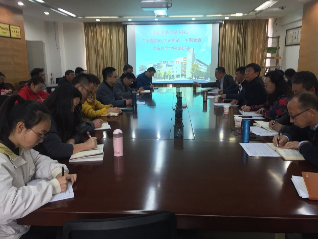2019年10月15日上午,校党委书记饶卫深入生命科学学院开展“不忘初心、牢记使命”主题教育专题调研,副校长郝淑美、党办主任吴新、组织部部长蔡金红、宣传部部长余冰释、教务处处长陈新、党办副主任杨晓岚、校办副主任刘波等参加调研。生命科学学院党政领导班子、党支部书记、教研室主任、党员代表及师生代表参加了本次调研。