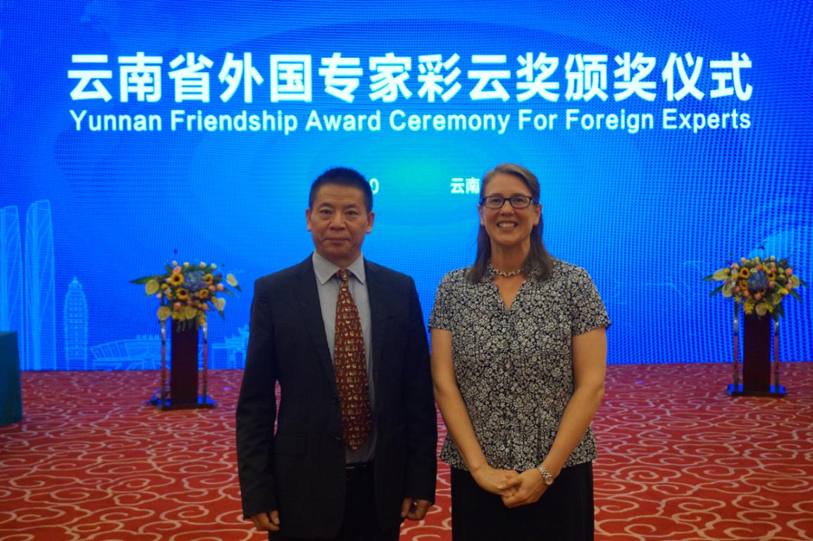 10月21日下午,2019年云南省外国专家“彩云奖”颁奖仪式在昆明举行,10位在滇工作的外国专家被授予“彩云奖”,表彰他们为云南发展作出的突出贡献。德赢官网外籍专家范秀琳老师(Cathryn Anne Yang)荣获2019年云南省外国专家“彩云奖”。