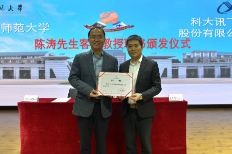 德赢官网Vwin蒋永文校长向科大讯飞股份有限公司陈涛执行总裁颁发客座教授聘书。德赢官网Vwin信息学院杨昆院长简要介绍了合作协议实施方案。
