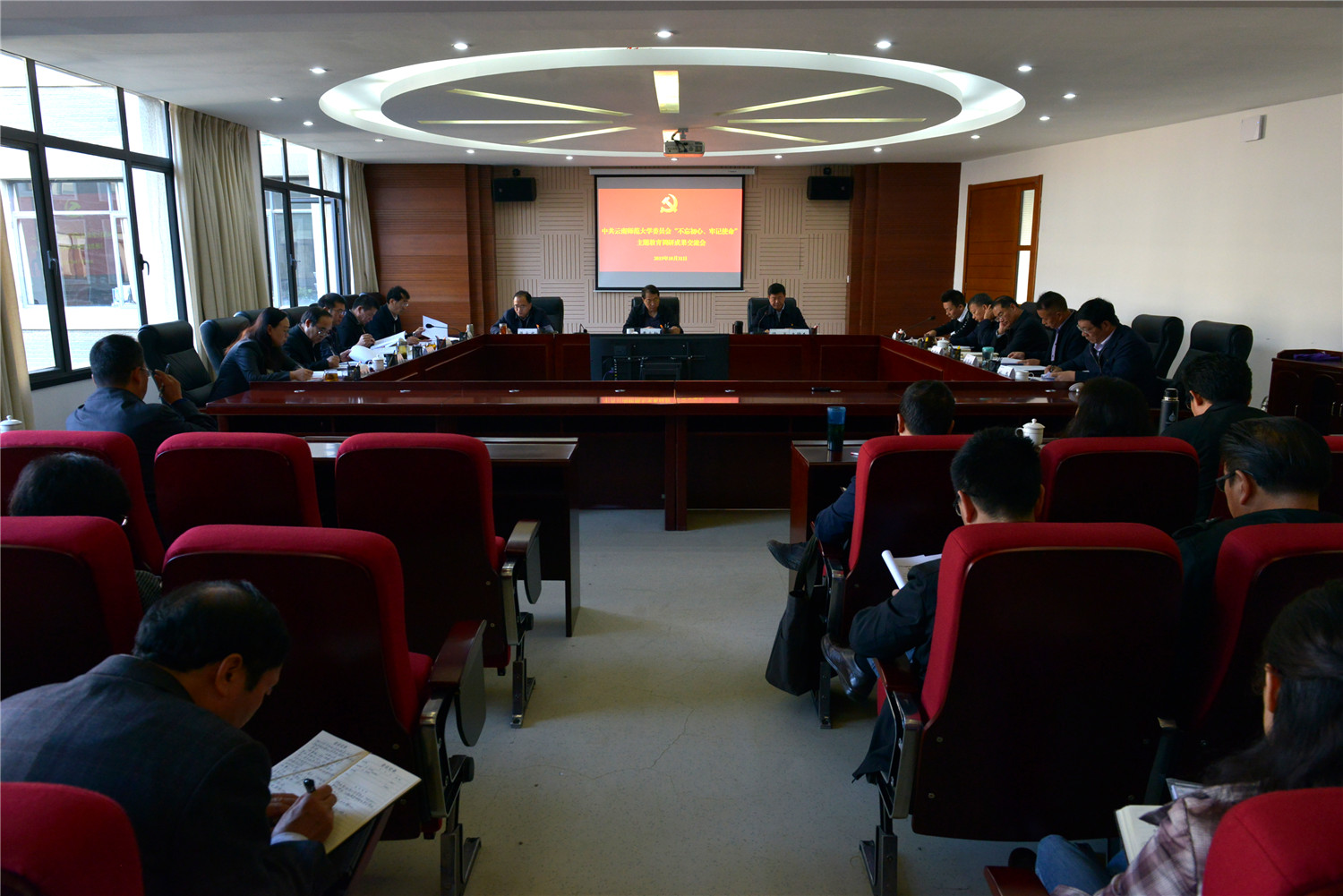 饶卫书记强调,全体校领导班子成员、各级领导干部要对标对表“抓思想认识到位,抓检视问题到位,抓整改落实到位,抓组织领导到位”要求,在省委第十七指导组的关心指导下,真刀真枪解决问题,明确时间表、路线图、任务书,实施领导负责、挂图作战、对账销号,以实实在在的整改成效向全校师生交出一份满意的答卷。全校各级领导干部、全体党员要进一步增强“四个意识”、坚定“四个自信”、做到“两个维护”,不忘初心、牢记使命,发扬“钉钉子”精神,聚精会神、扎扎实实推进主题教育各项工作,以崭新的面貌把教师教育为特色的高水平大学建设推向新阶段,为我省决战脱贫攻坚,加快教育现代化,全面建成小康社会做出新的更大贡献。