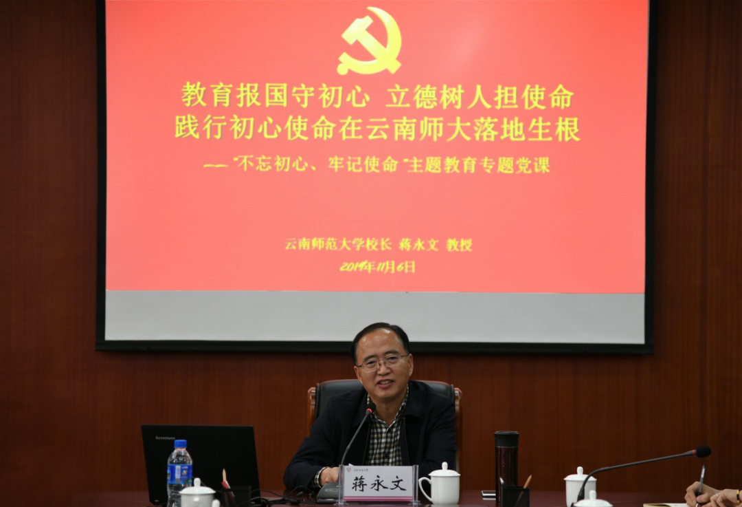 蒋永文同志结合主题教育开展以来自己的学习、调研和思考,从坚守初心和使命,努力办好人民满意的高等教育;践行初心和使命存在的差距和不足;用习近平新时代中国特色社会主义思想指导实践和推动改进工作的思路措施;践行党的初心使命在云南师大落地生根等四个方面展开讲授。在授课中,他运用白恩培、秦光荣等腐败案件给我们带来的警示,结合彭湃、方志敏等先烈的事迹体现出的共产党人的坚定信仰和追求,结合红军半床班子的故事、雷锋为人民服务的精神体现出来的宗旨意识等生动事例,进行深刻的分析,引起了大家的共鸣。