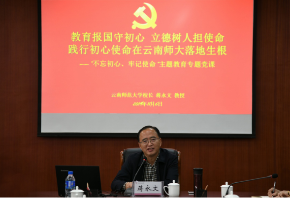 为认真贯彻落实中央、省委关于主题教育部署要求,按照《德赢官网Vwin党委领导班子开展“不忘初心、牢记使命”主题教育实施方案》安排,11月6日,校党委副书记、校长蒋永文同志在华文学院作了题为“教育报国守初心,立德树人担使命,践行初心使命在云南师大落地生根”的专题党课。华文学院、文学院、泛亚商学院、发展研究中心领导班子成员及上述学院党支部书记、师生党员代表参加了本次党课。