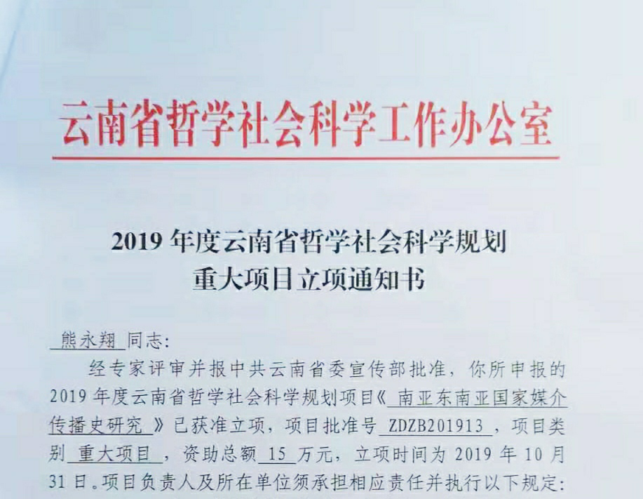 近日,中共云南省委宣传部公告了2019年度云南省哲学社会科学规划重大项目、重点项目立项名单。在所立项的13项重大项目中,德赢官网安学斌教授领衔的“新中国70年云南民族文化保护传承发展研究”和传媒学院申报的“南亚东南亚媒介传播史研究”获准立项研究。