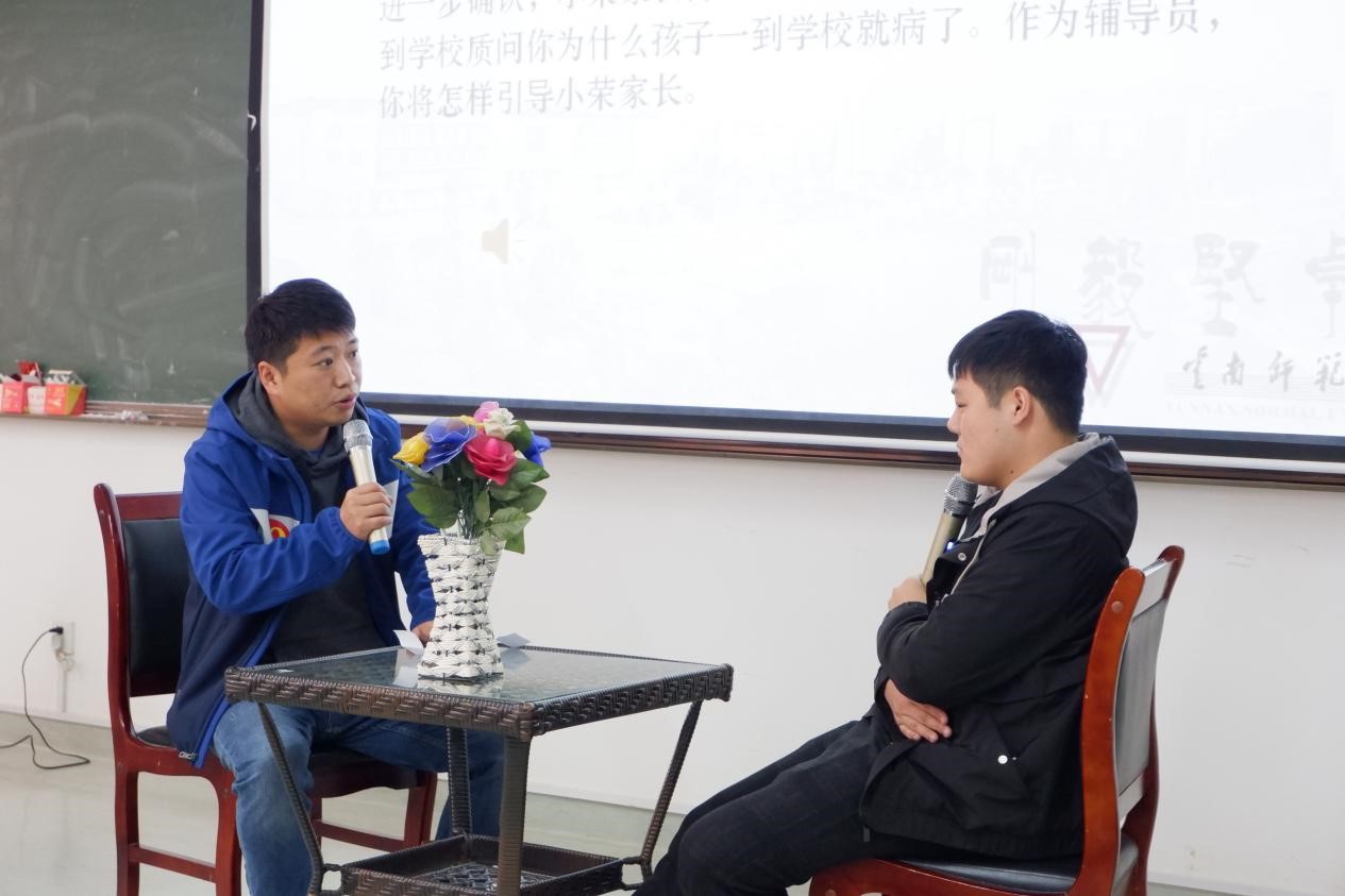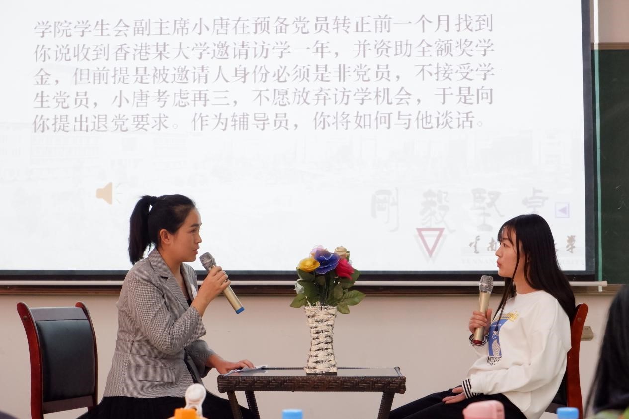 比赛分为两个阶段,经过第一阶段笔试(基础知识测试、案例分析、网文或公文写作)、主题班会两个环节的选拔,共有10名辅导员进入了第二阶段的比赛。第二阶段包括谈心谈话和理论宣讲两个环节,谈心谈话采取情景再现的方式开展,考察辅导员对相关理论政策、学生特征、学生成长成才规律的了解把握及对问题的解决能力和对学生的教育引导能力。理论宣讲着重考察辅导员对马克思主义理论、习近平新时代中国特色社会主义思想、党的十九大精神等的学习宣传阐释能力。