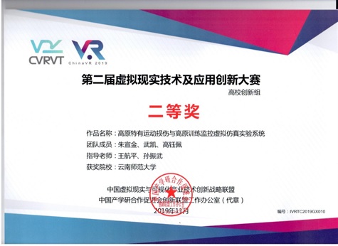 在11月22日举行的第二届中国虚拟现实技术及应用创新大赛(IVRTC 2019)颁奖典礼上,由德赢官网体育学院孙振武院长和王航平副教授指导的作品《高原特有运动损伤与高原训练监控虚拟仿真实验系统》荣获高校创新组二等奖。本次大赛吸引了来自全国各地50多所200多支队伍参赛。参赛高校包括了北京航空航天大学、中国海洋大学、华南理工大学、东北大学、北京科技大学等国内知名高校。