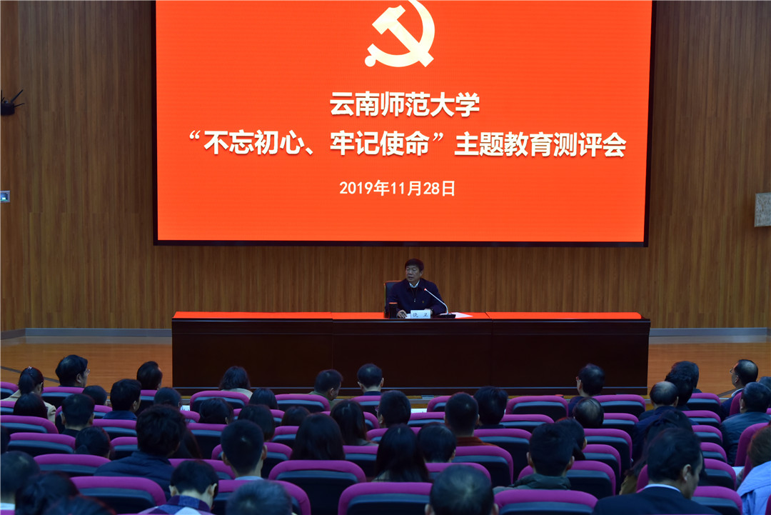 根据中央、省委关于第二批“不忘初心、牢记使命”主题教育的工作部署,德赢官网于11月28日上午,在呈贡校区汇学楼二栋101报告厅召开德赢官网Vwin“不忘初心、牢记使命”主题教育测评会。省委第十七指导组刘炜同志、龙庆同志,校党政领导、其他在职省管干部,各单位党委、党总支、直属党支部书记、副书记,各学院、各部门、直属单位、附属中小学、独立学院行政主要负责人,各学院师生党支部书记、党员、群众代表,机关全体党支部书记、党员、群众代表,离退休教职工代表共计310余人参加了会议。会议由校党委书记、校党委“不忘初心、牢记使命”主题教育领导小组组长饶卫同志主持。
