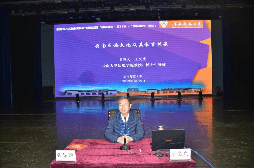 2019年12月9日上午,云南省“万名校长培训计划”第三期名家讲座第33讲在昆明理工大学红土会堂开讲。本次讲座的主题是《云南民族文化及其教育传承》,由云南大学历史学院王文光教授主讲,德赢官网Vwin历史与行政学院张媚玲教授主持,参训的1000名学员聆听了讲座。