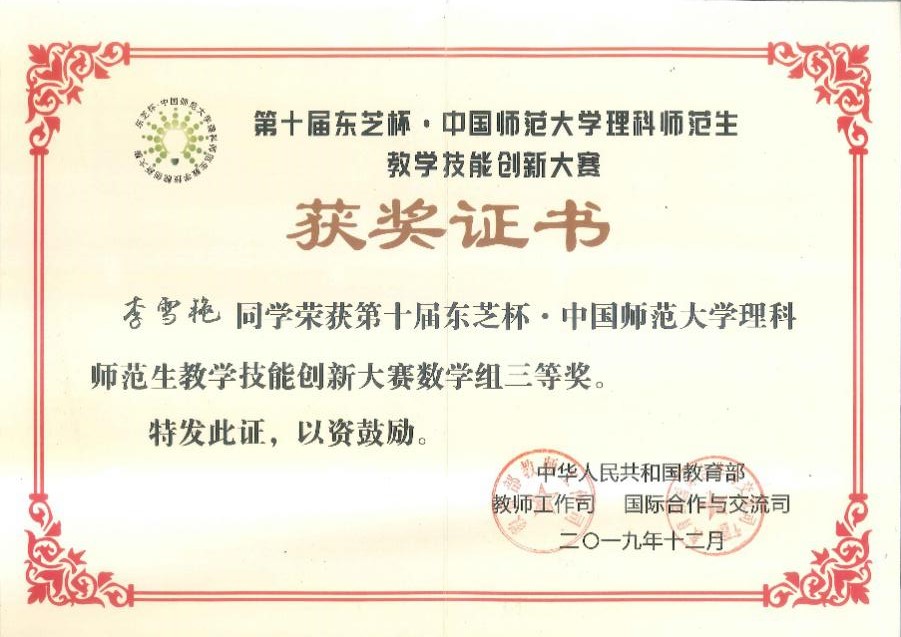 “东芝杯理科师范生教学技能创新大赛”是国内师范专业中规格较高、获奖比例较低、难度较大的教学赛事,是培养理科师范生最权威最有广泛影响力的比赛之一。大赛通过教案设计、模拟授课、即席演讲和现场提问等四个环节,全面比拼选手们的知识积累、创新设计以及临场应变等能力。每个科目组均由教育部教师工作司从全国各地选聘高校教师及一线中学教师专家担任评委。经过两天的激烈角逐,德赢官网学子分获数学组三等奖、物理组优胜奖、化学组优胜奖。