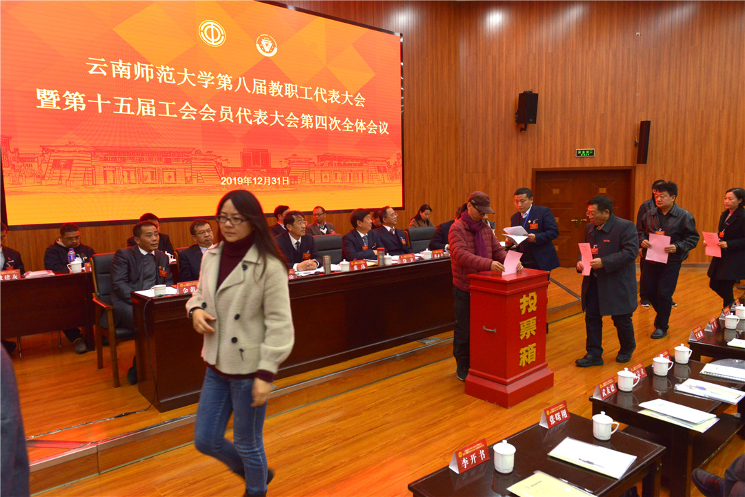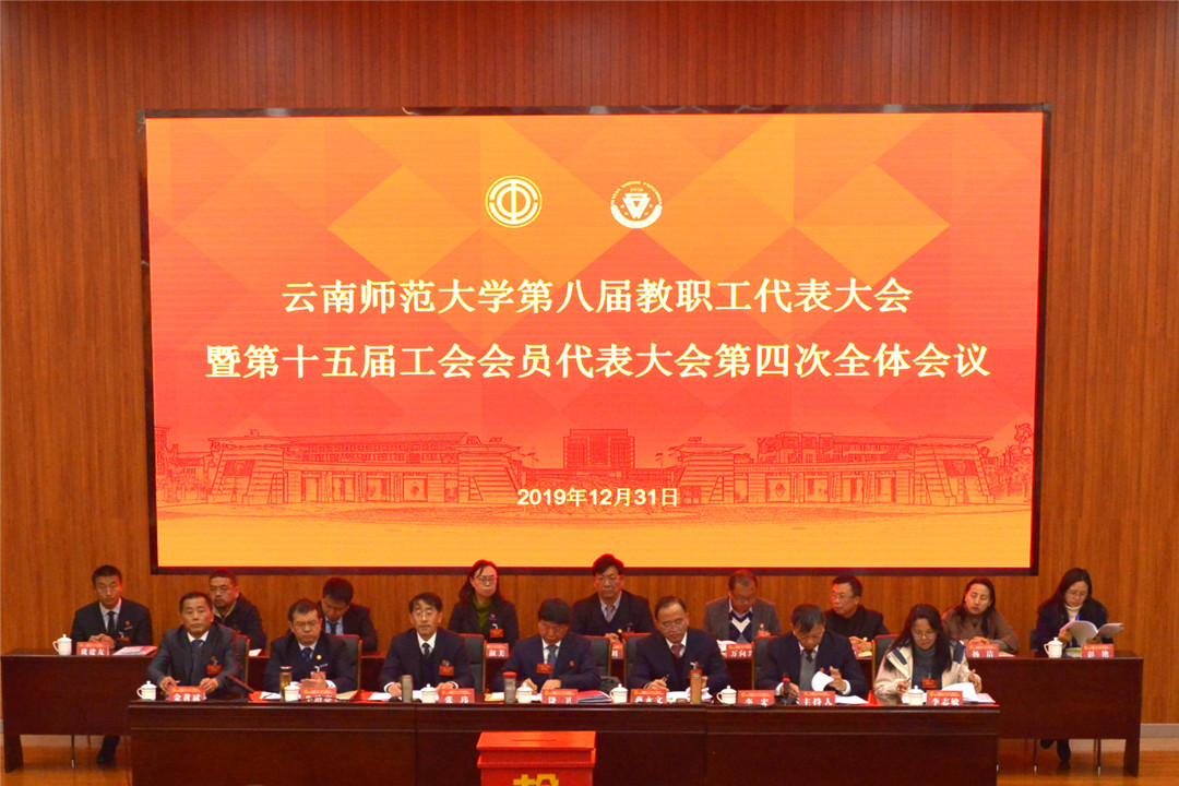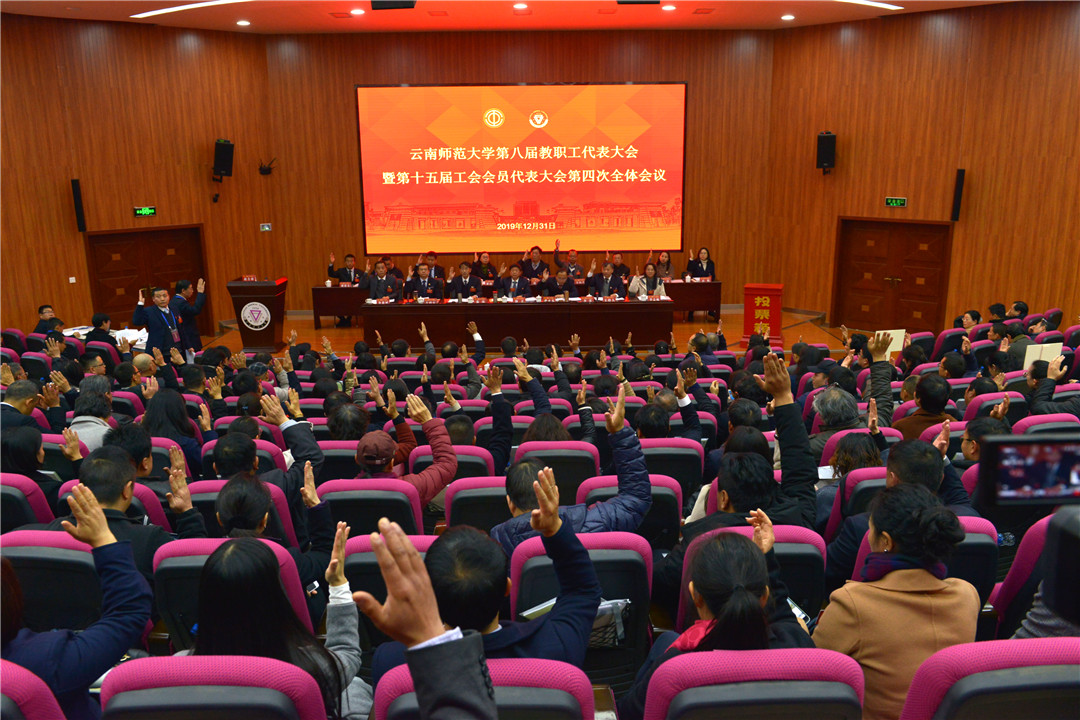 校党委饶卫书记作大会总结讲话。饶书记指出,此次大会的召开充分体现了广大教职工“当好主人翁、建功新时代”,积极投身学校改革建设发展事业的良好精神面貌,实现了统一思想、振奋精神、建言献策、深化改革的目标,为学校加快推进教师教育为特色的高水平大学建设营造了良好氛围。饶书记就进一步加强党的政治建设,确保各项改革平稳有序推进和落实提出了四点要求:一是要贯彻新时代党的建设总要求,始终把政治建设摆在首位,推动党的各方面建设全面进步全面过硬;二是要切实提高政治站位,深入学习贯彻党的十九届四中全会、省委十届九次全会精神;三是要加强对学分制改革、岗位聘用制改革工作的领导,确保改革目标实现;四是各级工会、教代会要不忘初心、牢记使命,不断提升履职能力。饶书记号召,全校广大教职工要紧密团结在以习近平同志为核心的党中央周围,始终不忘党的初心、永远牢记党的使命,大力弘扬“跨越发展、争创一流;比学赶超、奋勇争先”精神,在学校党委的领导下,弘扬传统、改革创新、勇于担当,加快推进教师教育为特色的高水平大学建设,不断提升服务云南“三个定位”和打好世界一流“三张牌”的能力,为实现云南教育现代化、全面建成小康社会做出新的更大贡献。德赢官网Vwin第八届教职工代表大会暨第十五届工会会员代表大会第四次全体会议在雄壮的《国际歌》声中圆满落下帷幕。