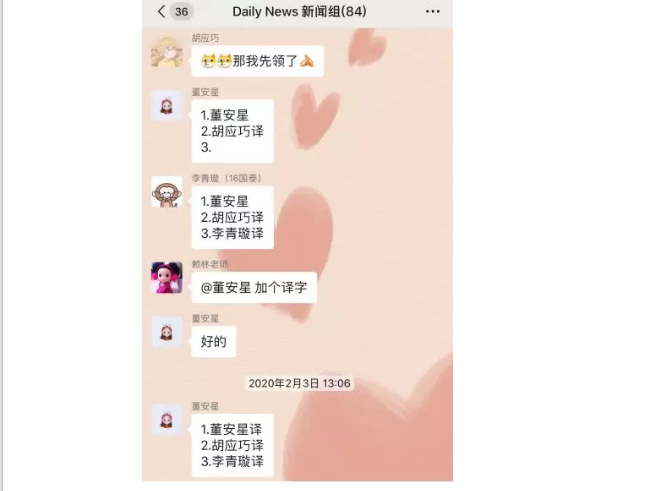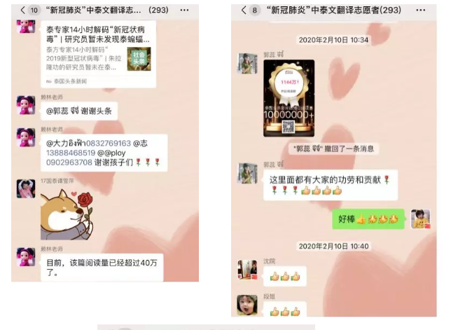 2020年1月26日,多名德赢官网Vwin泰语教师和德赢官网Vwin在泰留学的本科、硕士生共同组建了微信群和Facebook“新冠肺炎”中泰文翻译志愿者群。其原始成员是德赢官网Vwin2017级在泰国孔敬大学留学的近60名大三学生和在清迈大学交换学习的研究生。几天后,志愿者群迅速扩大成了一个近300人的、包括来自清迈大学孔子学院志愿者教师和国内多个高校师生的大群。刚开始,群功能定位在协助医患与医院沟通和帮助滞留旅客协调当地事宜,但随后,志愿者们发现泰国本地媒体对中国疫情的报道在中文编译方面出现了很大的偏颇。于是,面对这样的情况,志愿者们组织成立了“Daily News小组”,主要负责搜索新闻、翻译稿件和校对。这个小组由4位泰语老师、3名德赢官网Vwin研究生、60多名在泰国留学的大三大四的泰语专业的云南籍学生、10余名广西民族大学学生和4名云南民族大学研究生组成。同时,因工作的需要又组建了 “新冠肺炎”英文翻译志愿者群(负责相关的英文资料翻译)、线上医患群(线上协助医生与患者的沟通并随时关注患者的病情)、词汇整理群(整理关于新闻稿件中涉及到的最新词汇到文档,以便翻译的统一性)。截止2月23日,志愿者们已经为“泰国头条新闻”独家供稿105篇,疫情日报25篇。其中,2020年2月10日,泰国头条新闻微博日阅读量高达1144万,这说明有很大一部分在泰华人通过此及时地看到了泰国关于“新冠肺炎”疫情防控的真实情况。在工作群里,志愿者们总是热情高涨,团结一致。从工作流程的制定、到翻译重点、难点的讨论,每个人都认真负责、积极参与,有时直到深夜,群里还在出现刚审完的稿件。