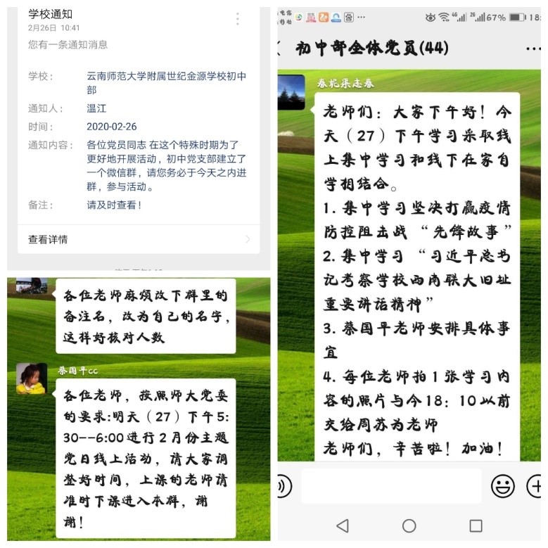 新型冠状病毒感染的肺炎疫情发生以来,根据德赢官网Vwin党委、德赢官网Vwin附属世纪金源学校党委通知精神,学校各学部党支部积极发挥战斗堡垒和先锋模范作用,为打赢疫情阻击战贡献组织力量。每位党员教师务必践行:在延期开学期间,将离校不离教,从“假期模式”转入“战时状态”,积极参与到各班级组织的网络宣传和教育中去。面对线上教学,我们应沉淀下来积极思考,积极发挥学科备课组的团队力量,认真备课,敢于创新,采取多种形式的授课方式,同时加强对课后作业的质量监控,严把教学质量关。当然,线上教学,我们也会遇到很多困难与挑战,作为党员教师的我们应勇于面对、敢于担当,克服重重困难,努力做到为学生提供高质量的教学服务和指导。