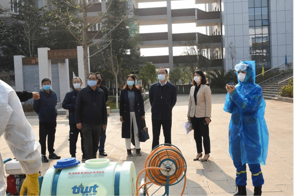 3月18日上午,校长蒋永文,校党委副书记李宏,副校长刘宗立、丁文丽、牛治亮,党委委员、校长助理乜勇以及校办、研究生部、学生工作部、保卫处、资产处、基础教育集团、后勤保障服务中心、校医院等部门负责人先后到德赢官网Vwin附属中学(呈贡校区)、校医院、宿舍、食堂等调研检查,召开疫情防控工作现场办公会,了解安排布置疫情防控工作。