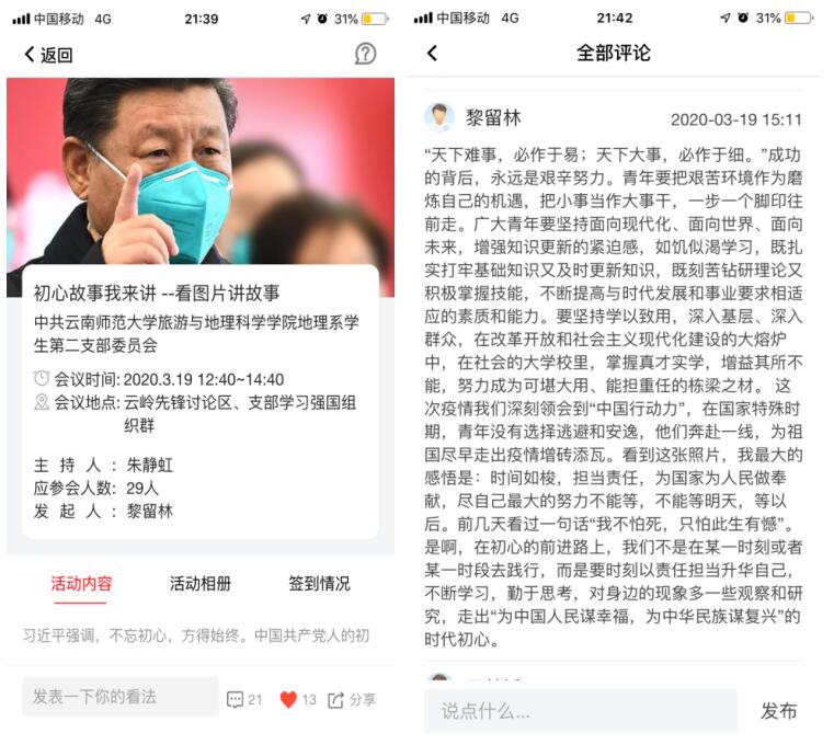 思想入心——各师生党员纷纷表示,一定将学习习近平总书记重要讲话精神所感所获转化为今后学习和工作的不竭动力。博士研究生党支部书记苏斌在观看云岭先锋夜校《推进2020年度基层党建各项重点任务落实总要求》以后说:“通过认真学习本期夜校教育内容,我认识到了中央、云南省委在过去四年当中所做的基层党建工作,所取得的成效和存在的不足以及下一步的工作规划;了解2020年发展党员工作的重点;学习了如何以党建为引领统筹推进城乡基层治理,以及如何加强基层党组织自身建设等工作;学习了我省在落实党委(党组)书记管党治党责任方面的具体措施;了解了党员培训教育中的具体任务以及如何压实党员培训工作;学习了当前开战“智慧党建”的背景和总体目标。”研究生党支部预备党员陈杨说:“作为一名研究生预备党员,在观看本期云岭先锋夜校之后,我更加深刻的认识到推进基层党建工作的重要意义。基层党建工作没有终点,我们要始终牢记习近平总书记对云南发展定位的新要求,结合云南实际推进基层党建工作。在今后的学习、工作中,我将不断提高政治站位,牢记初心使命,勇于担当作为,为新时代中国特色社会主义建设贡献青春的智慧和力量,只争朝夕,不负韶华!”