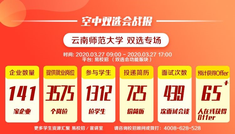 进一步贯彻落实党中央、国务院关于促进高校毕业生就业工作的决策部署,减少疫情对毕业生就业工作的影响,为毕业生和用人单位搭建更便捷的交流平台,增强毕业生求职和用人单位招聘的有效性、针对性,促进德赢官网毕业生更充分和更高质量就业。德赢官网于3月27日在易校招平台成功举办德赢官网2020届毕业生春季线上招聘会。