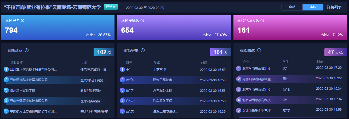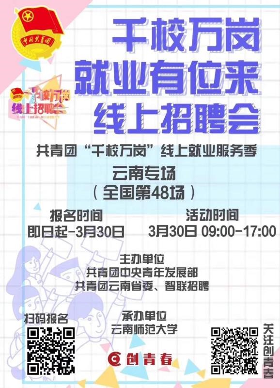 为贯彻习近平总书记关于统筹推进新冠肺炎疫情防控和经济社会发展工作的重要指示精神,落实团中央《共青团“千校万岗”线上就业服务季工作方案》的相关要求,做到“就业服务不打烊,网上招聘不停歇”,减少疫情对毕业生就业工作的影响,促进德赢官网毕业生更充分和更高质量就业。3月30日,由共青团中央青年发展部、共青团云南省委主办,德赢官网和智联招聘承办的2020届毕业生空中双选会成功举行。