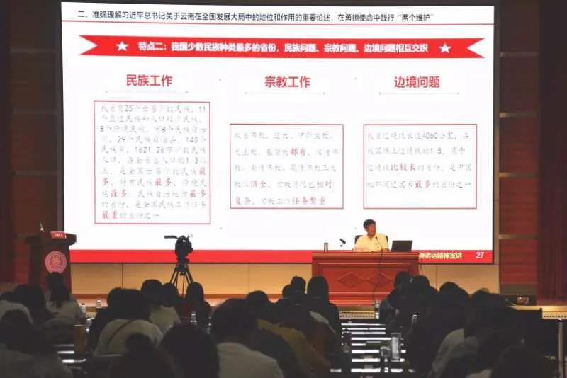 饶卫书记以《牢记嘱托 不负韶华 沿着习近平总书记指引的方向接续奋进》为题,围绕以下五个方面进行宣讲:一是准确把握习近平总书记考察云南重要讲话精神的重大理论意义和现实意义,坚定不移沿着总书记指引的方向奋勇前进。二是准确理解习近平总书记关于云南在全国发展大局中的“四个特点”的重要论述,在勇担使命中践行“两个维护”。三是准确把握习近平总书记对云南作出的“四个方面重要指示”的深刻内涵,把总书记为云南谋划的宏伟蓝图变为美好现实。四是深刻领会习近平总书记考察西南联大旧址重要指示精神,大力培养有历史感、责任感、志存高远的时代新人。五是抢抓重大机遇,推动习近平总书记考察云南重要讲话精神在德赢官网Vwin落地生根、开花结果。饶卫书记的宣讲报告主题鲜明、逻辑严密,深入浅出接地气,系统阐释了习近平总书记考察云南重要讲话精神的重大意义和丰富内涵,为我们进一步全面理解习近平总书记考察云南重要讲话精神,深刻领会其中蕴含的世界观、价值观和认识论、方法论,准确把握云南各项事业在全国发展大局中的坐标方位、前进方向,确保各项事业始终沿着正确方向前进提供了思想支撑,也为我们进一步从中华民族伟大复兴的战略高度弘扬西南联大爱国精神,培养社会主义建设者和接班人提出了努力方向。