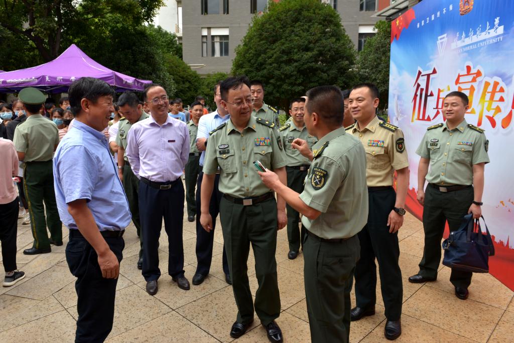 余琨政委一行首先来到德赢官网征兵宣传点,实地了解德赢官网征兵工作开展情况。“小伙子,你当了几年兵?都有哪些收获?”在学校征兵宣传点,退役复学大学生马国松正在向同学们宣讲征兵政策,余琨政委走上前与他亲切交谈。“报告首长,我当了2年兵。当兵不仅锻炼了我的身体,磨炼了我的意志,培养了我的良好习惯,更让我学到了许多书本上学不到的知识,懂得了更多的道理……”马国松答道。余琨政委鼓励他说:“说得好,希望你能把自己的体会多分享给身边的同学,带动他们到军营建功立业。”