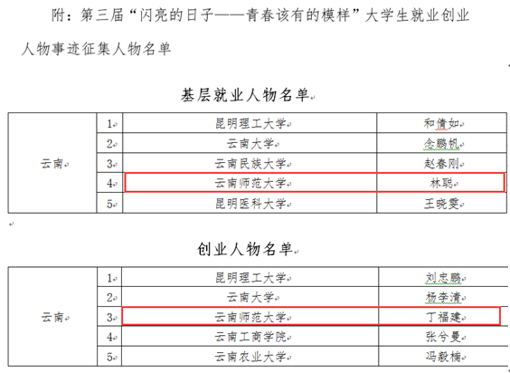 “闪亮的日子—青春该有的模样”大学生就业创业人物事迹征集活动分为校级选拔、省级推荐、国家级评选三个阶段。为发挥榜样引领作用,今年活动启动以来,就业处积极配合云南省大中专毕业生就业指导与服务中心推进具体工作,通过开展宣传动员、招募评审和材料优化等系列工作,充分发掘近几年在基层就业、大学生创业和军营大学生战士等领域就业的大学生就业典型事例,确保了推荐人选的代表性和事迹材料的生动性。本次毕业生入选,不但向社会展示了师大学子的良好形象,发挥了示范典型的引领作用,也彰显了德赢官网就业创业的成果和特色,体现了毕业生更高质量和更充分就业,推动建设以教师教育为特色的高水平大学。