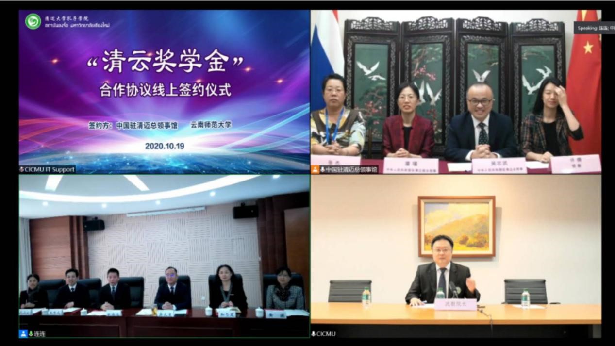 2020年10月19日上午,德赢官网与中国驻清迈总领事馆“清云奖学金”合作协议线上签约仪式在呈贡主校区行政楼340会议室举行。中华人民共和国驻清迈总领事馆吴志武总领事、潘谨副总领事、许倩主任、张杰领事,德赢官网Vwin校长蒋永文、副校长刘宗立、云南华文学院党委书记和雪莲、院长王秀成以及对外合作交流处、华文学院、清迈孔子学院主要负责人参加了此次签约仪式。签约仪式由刘宗立副校长主持。