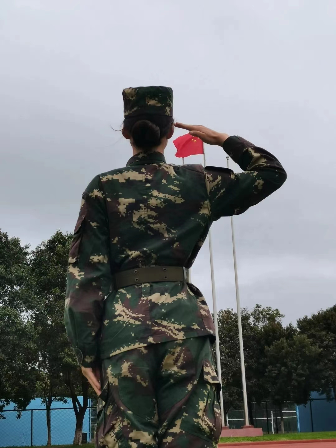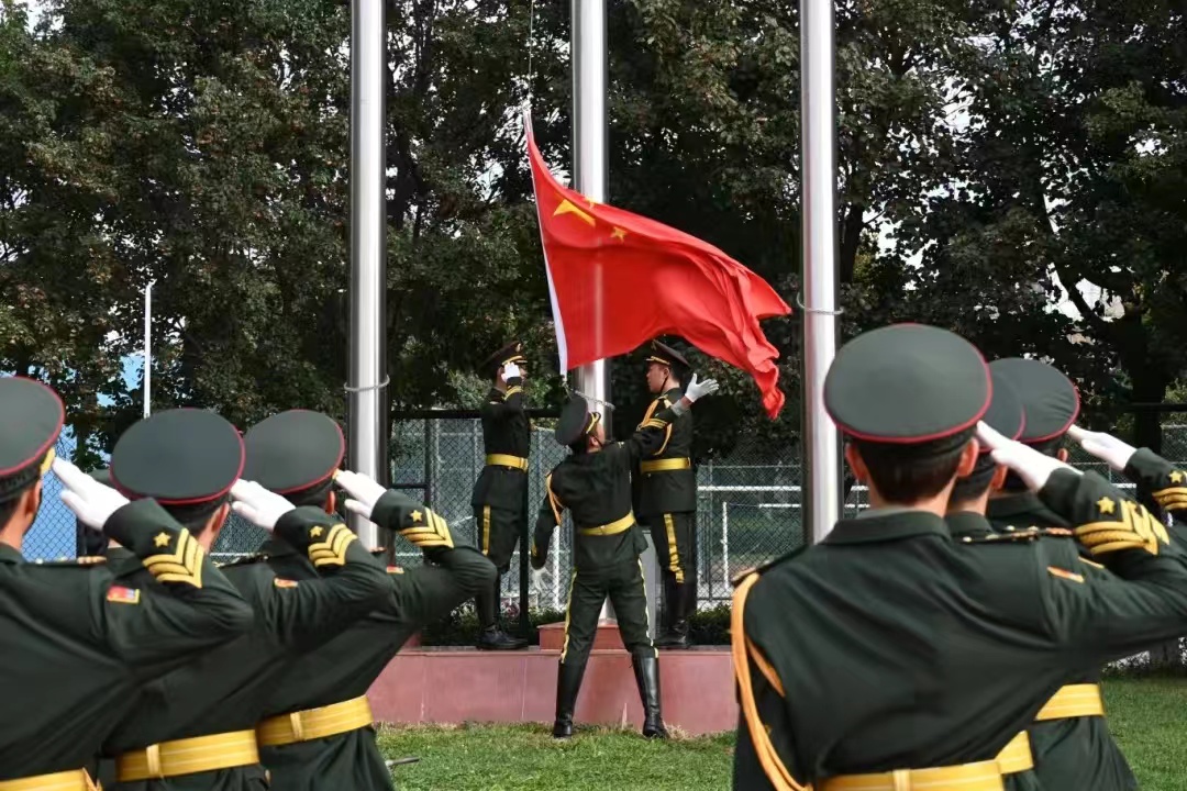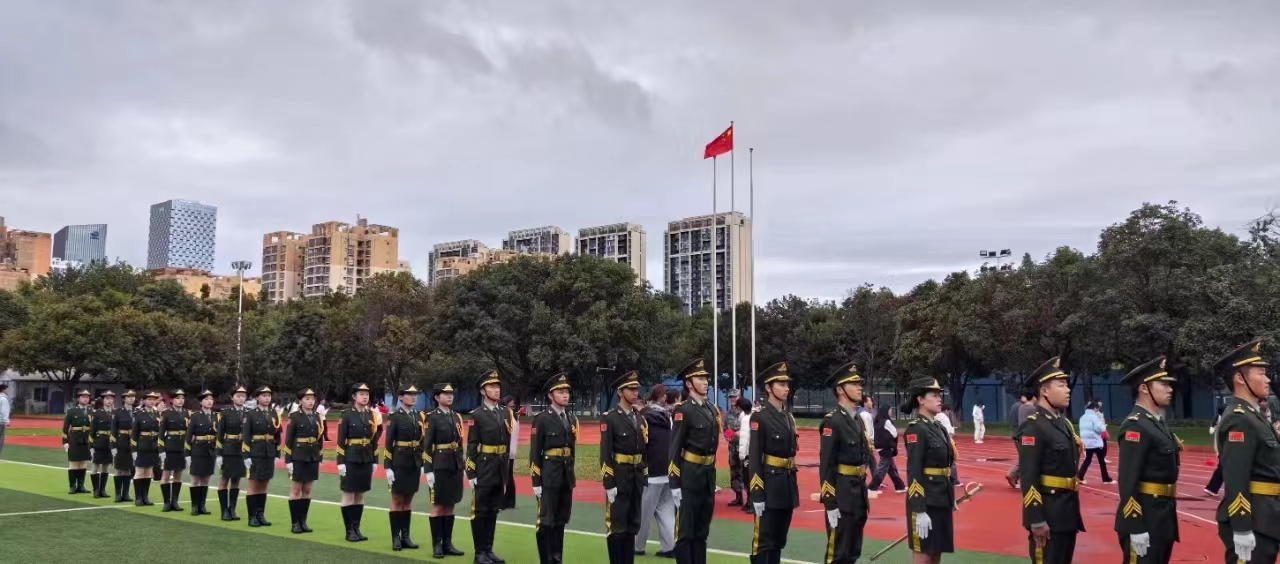 全体师生朝气蓬勃、精神抖擞,国旗护卫队队员迈着矫健的步伐,护送鲜艳的五星红旗走向升旗台。全体师生肃立,面向国旗行注目礼。
