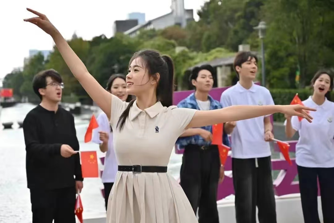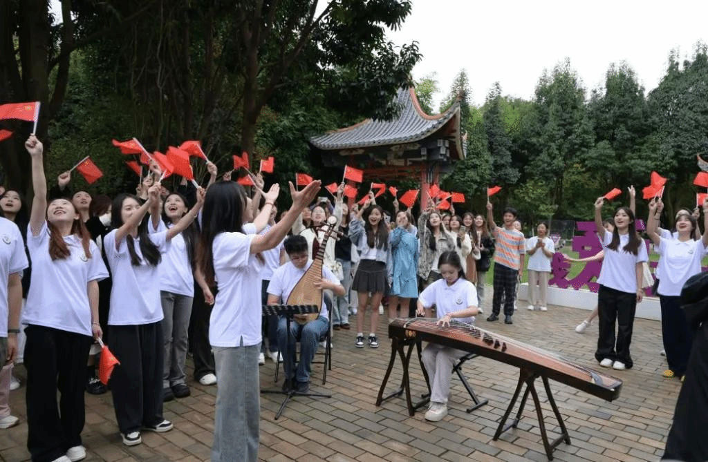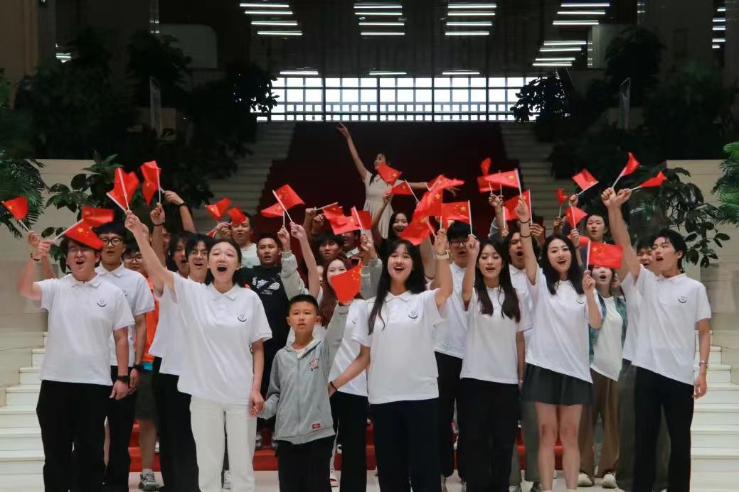 同学们挥动五星红旗、放声高歌
