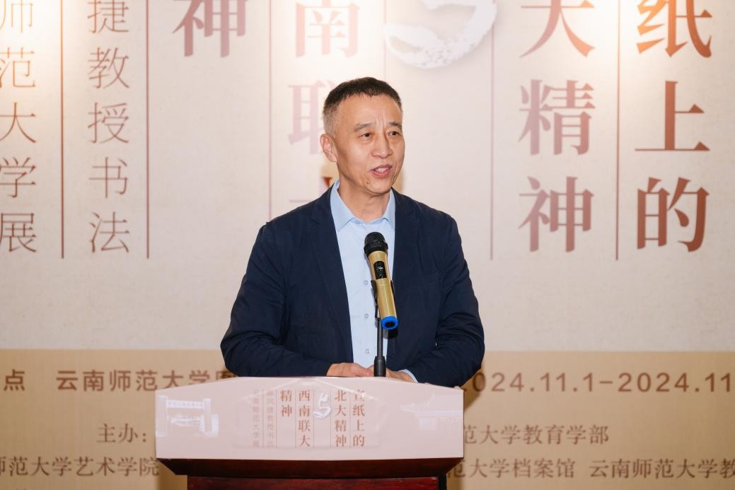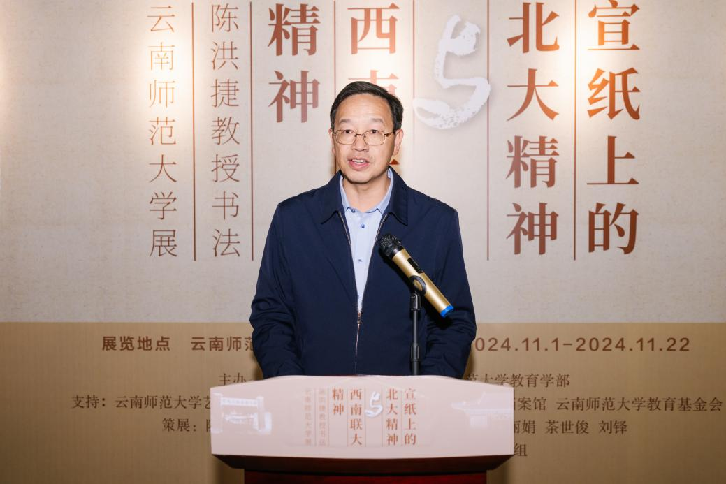 陈正权在致辞中对陈洪捷表示感谢,指出此次借由书法家陈洪捷老师苍劲有力的笔墨,将北大、西南联大、云南师大薪火相传的大学精神呈现给师生,并珍藏于校园内,必将涵养和激发一代又一代莘莘学子在青春之路上踔厉奋发、润身淑世,谱写新时代华章。