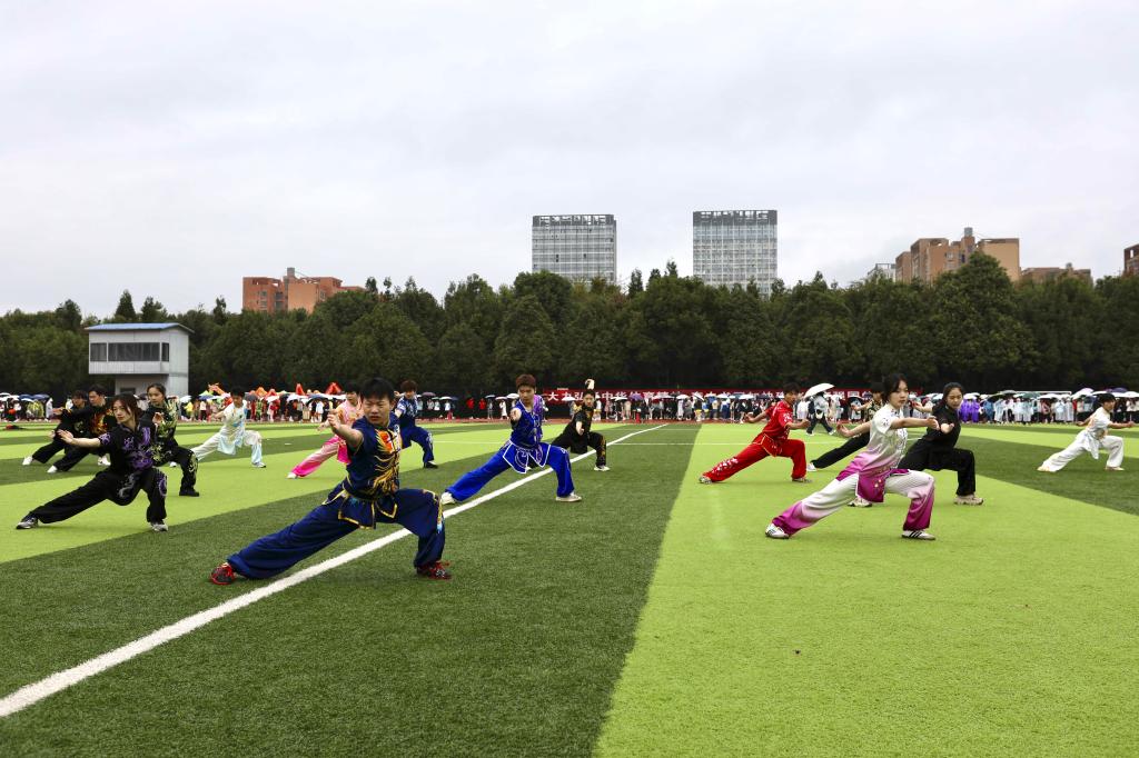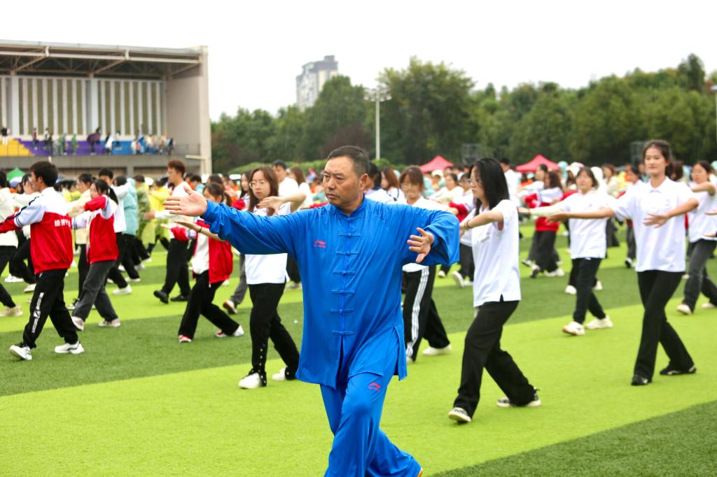 开幕式上,师生们观看了由体育学院学生带来的舞龙、武术表演,由各学院学生代表带来的千人太极表演和千人啦啦操表演。