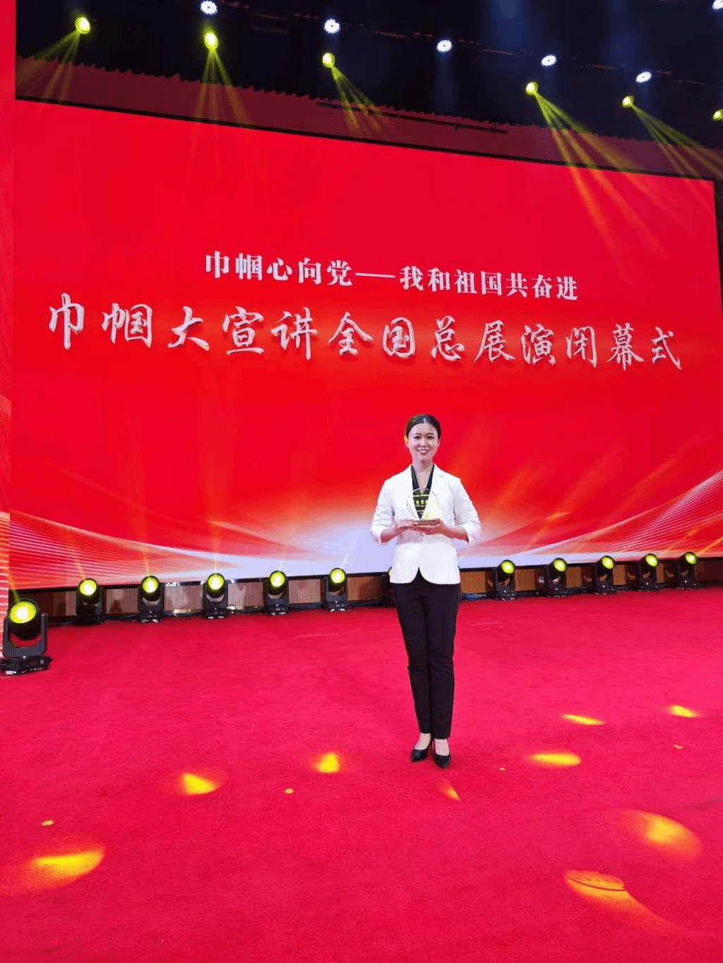 在闭幕式上,除宣讲故事外,王馨还参加了情景朗诵《我与祖国共奋进》、大合唱《我和我的祖国》等节目展示,并获得由全国妇联宣传部、国家文物局革命文物司颁发的“巾帼心向党——我和祖国共奋进”优秀宣讲员称号。