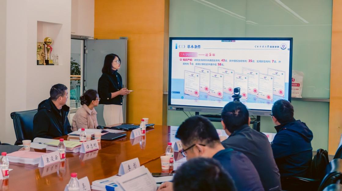 信息学院院长袁凌云教授围绕学科情况、培养目标、学位授予标准、基本办学条件、人才培养、服务贡献等方面,汇报了计算机科学与技术硕士学位授权点近年的建设情况。