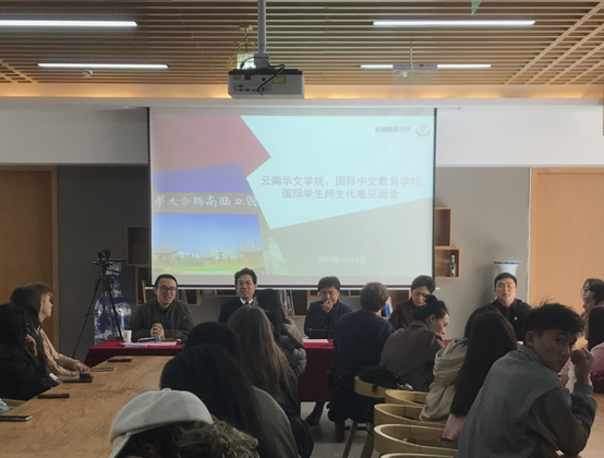 为加强与国际学生沟通交流,提升国际学生教育、管理、服务水平,12月5日下午,云南华文学院召开国际学生系列座谈会。学院党委书记和雪莲、院长王秀成、国际学生管理部门教师代表,30个国家80名国际学生参加了座谈。座谈会由副院长戴思远主持。