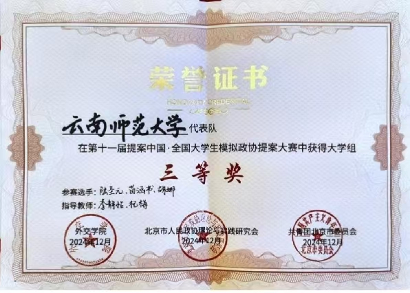 近日,“提案中国·第十一届全国大学生模拟政协提案大赛”结果揭晓。经过初选、复赛、决赛,由法学与社会学学院(云南纪检监察学院)杞梅、李静怡老师指导,2022级法学(纪检监察方向)本科生陆圣元、苗涵书、胡娜的参赛作品《关于深入推进法治乡村建设的提案》获全国三等奖。