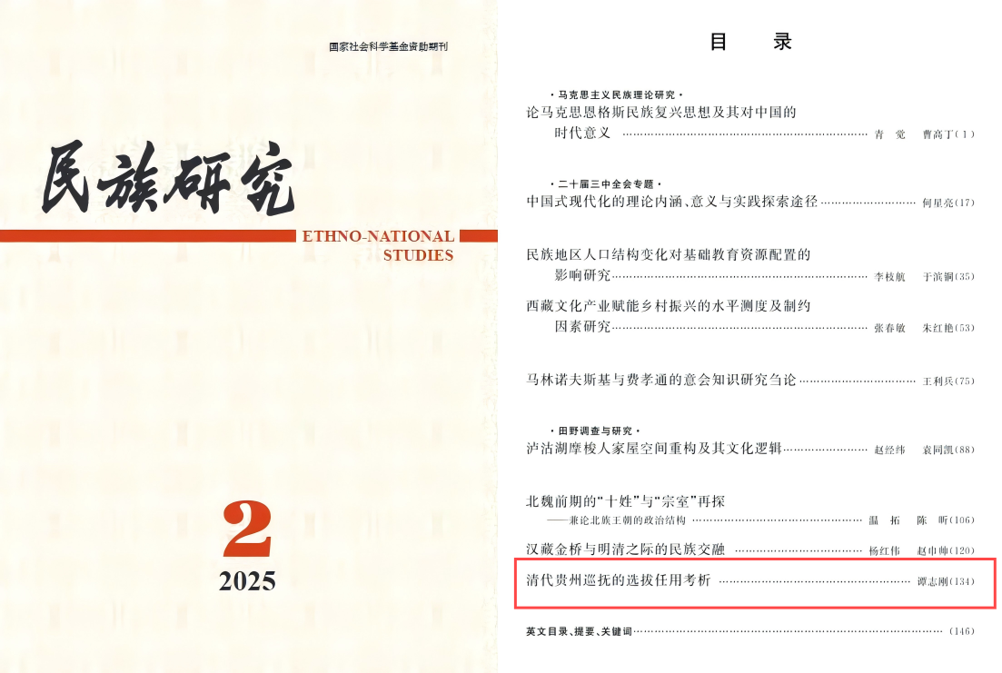 日前,德赢官网学科建设办公室谭志刚副教授在《民族研究》2025年第2期发表学术论文《清代贵州巡抚的选拔任用考析》,该文是依托国家社会科学基金中国历史研究院重大历史问题研究专项“清代大一统国家边疆民族治理对中华民族共同体的形塑研究”取得的标志性阶段成果。