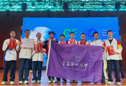 今年是云师大附中第二次参加地科奥赛。去年学校4人参赛取得四块金牌,2人进入国家集训队,实现了云南赛区在该项赛事上金牌零的突破。今年学校成绩又有新的突破:初赛中有25人获省一等奖,占全省三分之一,10人入选省队,是全国入选决赛人数最多的学校。决赛获得5金2银3铜的好成绩,奖牌总数和金牌总数全国第一,张俊宇同学取得全国第三的好成绩,张俊宇、于阅(第31名)和朱子言(第51名)三位同学进入国家集训队,最终张俊宇同学成功入选国家队。