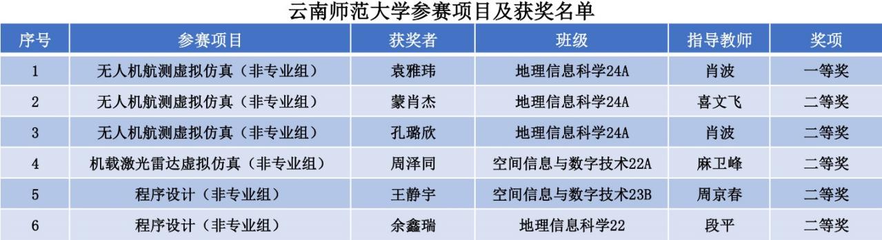 地理学部14名选手从云南省省赛中脱颖而出,晋级国赛非专业组测绘技能和开发设计竞赛。赛前,学部组织专业教师对选手进行了系统强化训练。比赛中,选手们沉着应战,展现出扎实的专业技能和出色的应变能力。最终,袁雅玮、蒙肖杰、孔璐欣凭借精准的航线规划和数据处理能力,分别获无人机航测虚拟仿真比赛(非专业组)一、二等奖;周泽同以稳定的操作表现获机载激光雷达虚拟仿真比赛(非专业组)二等奖;王静宇、余鑫瑞依靠高效的算法设计,获程序设计比赛(非专业组)二等奖。