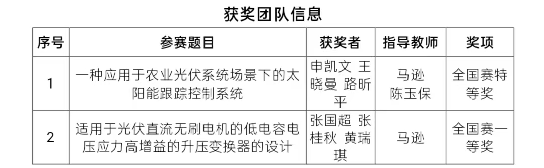 德赢官网能源与环境科学学院的两支队伍从云南省省赛中脱颖而出,进入全国总决赛。赛前学院组织专业教师对两支队伍进行强化训练,比赛过程中同学们沉着冷静、灵活应对,展现出扎实的专业技能。经过激烈角逐,申凯文、王晓曼、路昕平同学的作品“一种应用于农业光伏系统场景下的太阳能跟踪控制系统”以及张国超、张桂秋、黄瑞琪同学的“适用于光伏直流无刷电机的低电容电压应力高增益的升压变换器的设计”分别获得全国赛特等奖和一等奖,指导老师马逊、陈玉保获大赛优秀指导教师称号。