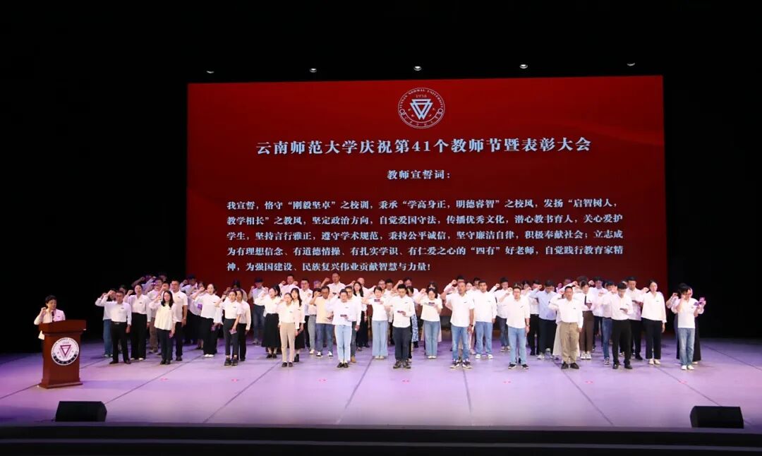 教师代表罗毅、实验中学教师代表崔洁分享教育感受。罗毅围绕“传承、坚守、耕耘、感恩”四个关键词,讲述其在教学与科研路上的点滴实践与感悟,“展望未来,我将继续以西南联大先贤为榜样,扎根红土,坚守讲台,以科研守护绿水青山,以教育延续家国使命。我也坚信,只要我们众志成城、同心同向,定能让教育之光照亮云岭千山万水,让高原明珠永葆清澈,让边疆教育书写更加绚烂的时代华章!”他激动地说。