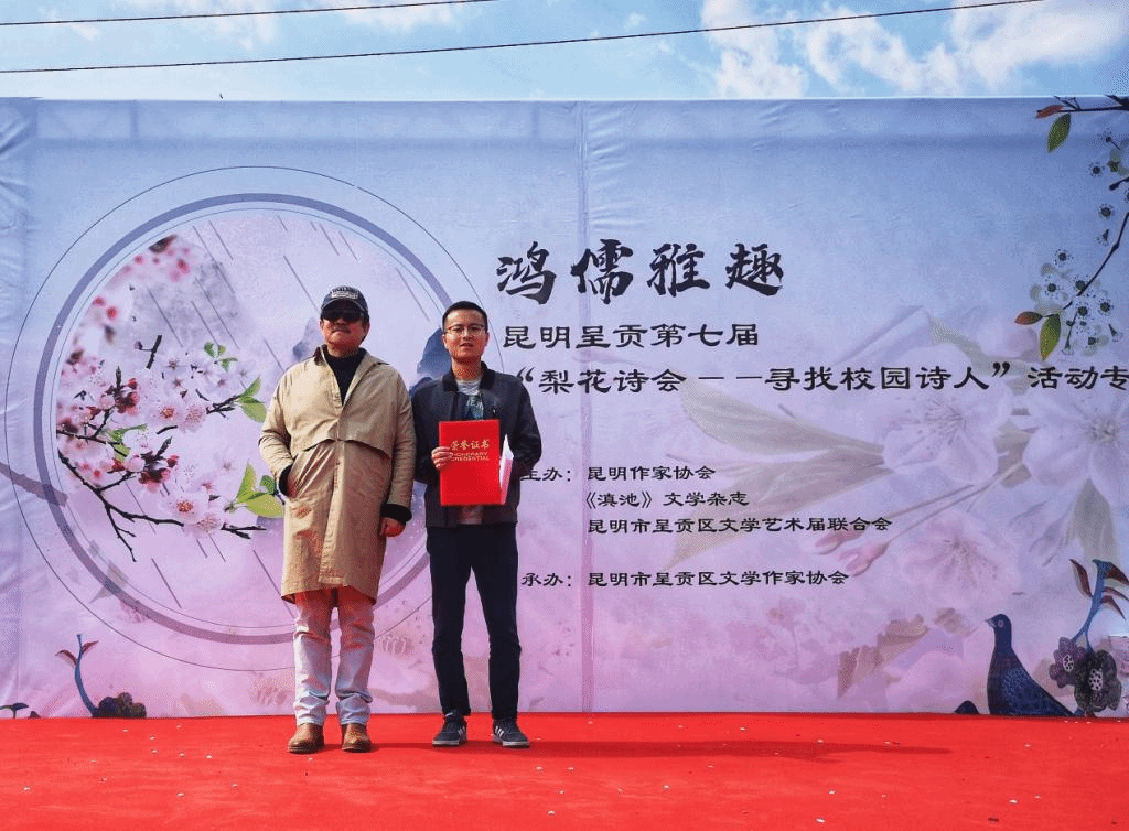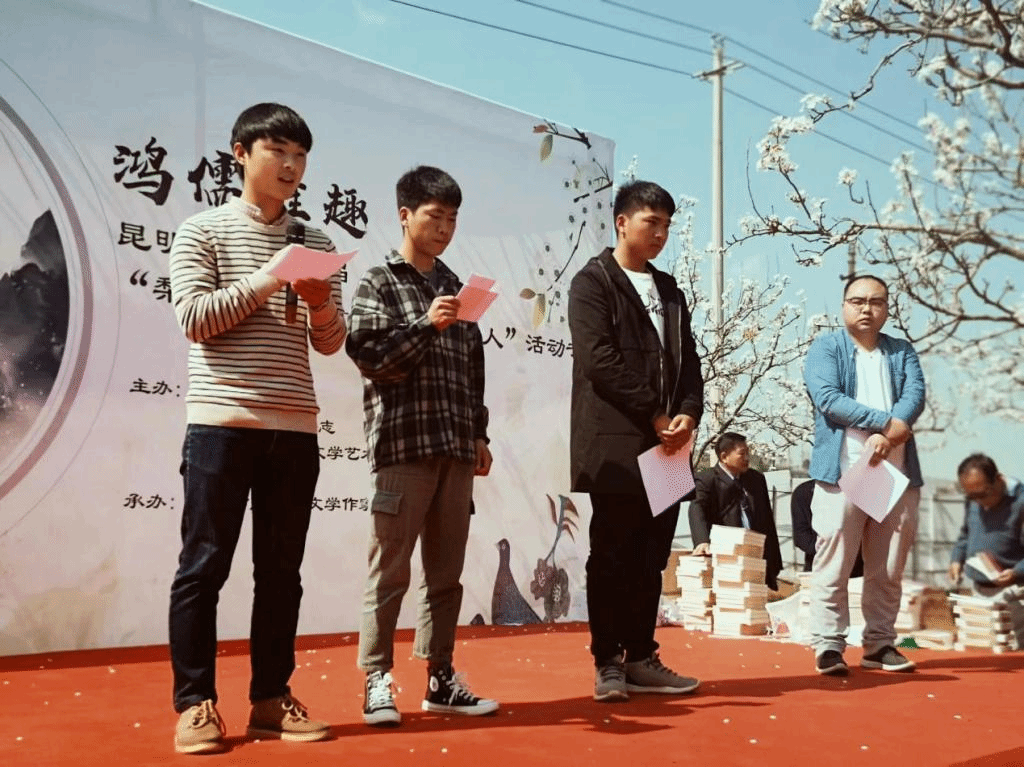2019年3月17日上午,由昆明作家协会、《滇池》文学杂志、呈贡区文学艺术界联合会主办,呈贡区文学作家协会承办的第七届呈贡梨花节系列活动之“梨花诗会——寻找校园诗人”在呈贡万溪冲村口梨园中举行。文学院汉语言文学专业朱自清班2016级学子罗文斌、谢吴非及2015级学子王晨颖、师国骞与其他在昆高校的18位学子荣膺第七届呈贡梨花节“校园诗人”称号。活动中,他们依次登台朗诵了自己入选本届梨花诗会并将发表于《滇池》(2019年第5期)的代表诗歌作品,讲述了自己写作的背景和创作经历,分享与诗歌的缘分和故事。校园诗人们声情并茂,侃侃而谈,现场气氛热烈融洽,谐和温馨。